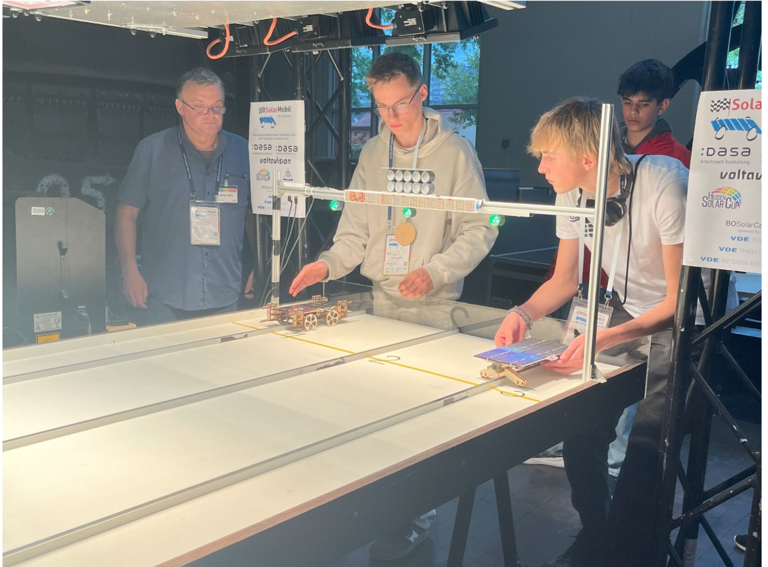 SolarMobil ist ein nationaler MINT-Wettbewerb, der Schülerinnen und Schüler im Alter von etwa 10 bis 18 Jahren dazu einlädt, solarbetriebene Modellfahrzeuge zu bauen, die sowohl durch kreative Konstruktion als auch durch ihre Rennleistung überzeugen müssen. Ein spannender Mix aus Technik, Nachhaltigkeit und Teamarbeit – eben genau am Puls der Zeit. Der Austragungsort für das Bundesfinale, die DASA Arbeitswelt Ausstellung in Dortmund, hätte kaum passender sein können: Ein besonderer Ort, der Technikbegeisterung und Innovationskraft auf einzigartige Weise miteinander verbindet. Für das diesjährige Bundesfinale qualifizierte sich das Team Sunergy um Silas Leypoldt und Jonas Steins aus der Oberstufe mit dem 1. Platz beim bayerischen Regionalentscheid auf dem Gelände des Umweltbildungszentrums in Augsburg.
